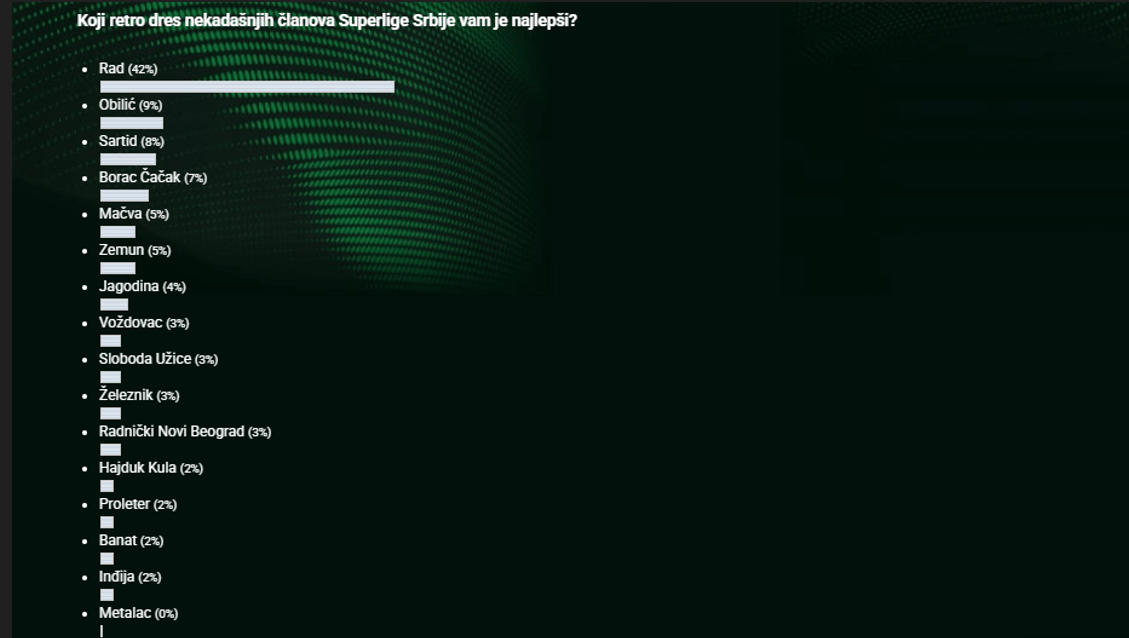 Igrali smo se i napravili anketu. Možda je pored najlepšeg retro dresa dala i rezultat koji vam klub najviše nedostaje u eliti. U anketi MaxBet Sporta učestvovali su retro dresovi nekadašnjih superligaša i osvajala trofeja: Jagodine, Železnika, Sartida, Obilića, Budućnosti iz Banatskog dvora, Hajduka iz Kule, Borca iz Čačka, Inđije, Metalca, …